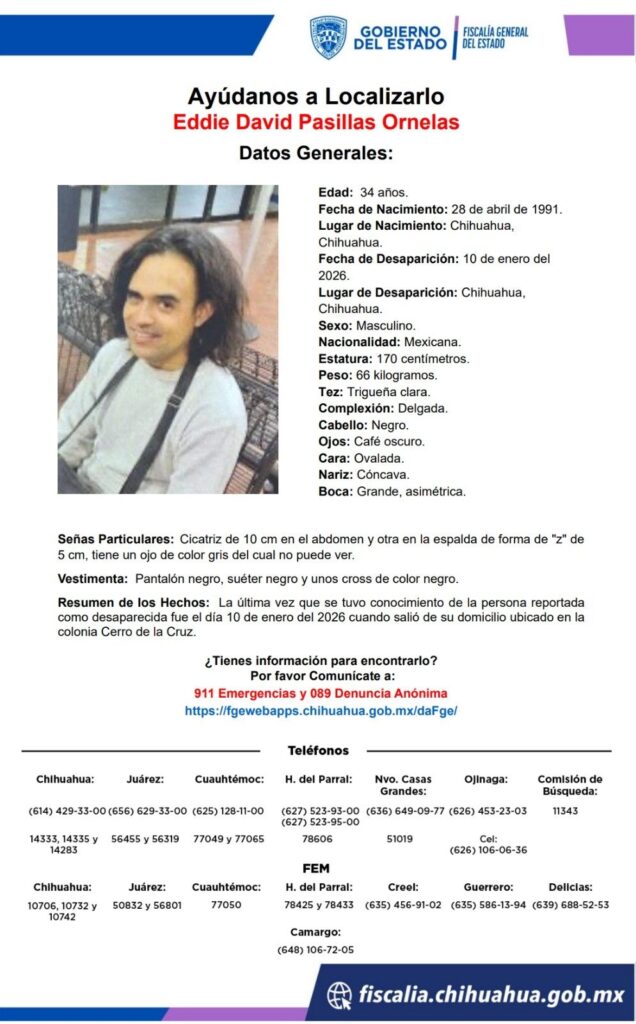 H. Cd. de Chihuahua.- (En Blanco y Negro) Autoridades estatales emitieron una ficha de búsqueda para dar con el paradero de Eddie David Pasillas Ornelas, de 34 años de edad, quien fue reportado como desaparecido desde el 10 de enero de 2026 en la ciudad de Chihuahua. De acuerdo con la información oficial, la última […]