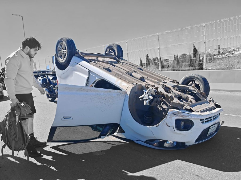 H. Ciudad de Chihuahua, Chih.- Un aparatoso accidente se registró la tarde de este miércoles en el puente que conecta el Periférico de la Juventud con la avenida La Cantera, donde el exceso de velocidad en la curva provocó la volcadura de un vehículo compacto.