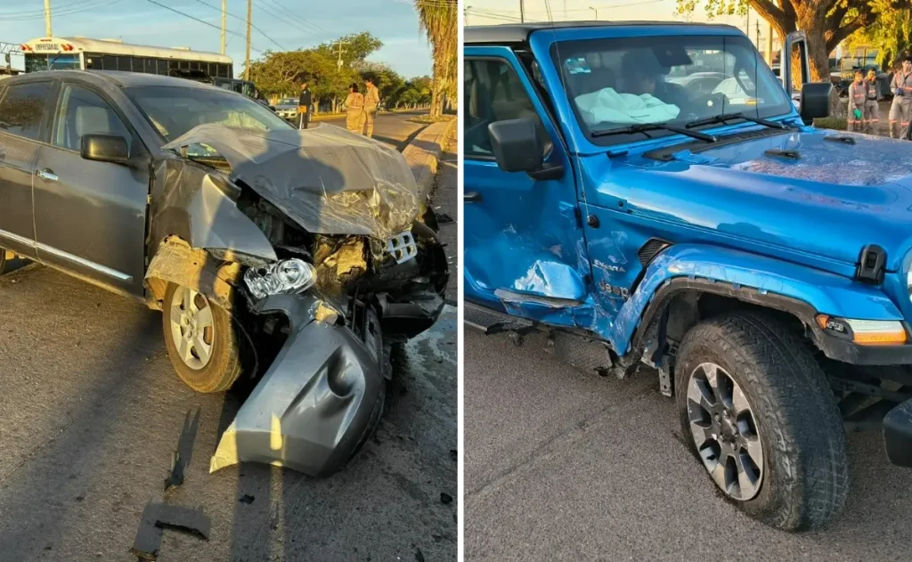 El accidente fue protagonizado por el conductor de una vagoneta de la marca Jeep Renegade Sahara, de color azul, modelo 2023, con placas de circulación VFE-807-D de Sinaloa, y una vagoneta de la marca Nissan, línea Rogue, de color gris, modelo 2011, de procedencia extranjera y con engomado MEC-32650 empadronado.