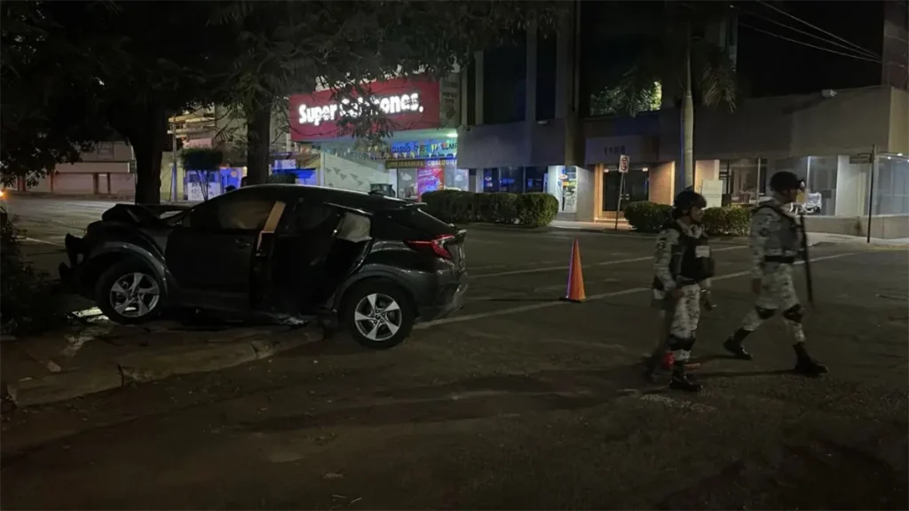 Metros antes de llegar al cruce con la calle Río San Lorenzo el conductor de una camionetaToyota Tacoma que presuntamente venía en persecución lo obligó a desviarse hacia la izquierda provocando que se subiera a la banqueta y se estrellara contra un árbol y la barda de la casa de gobierno.