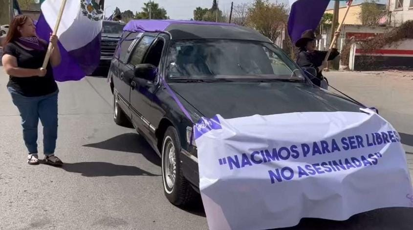 Carroza fúnebre encabeza movilización del 8M en Aldama