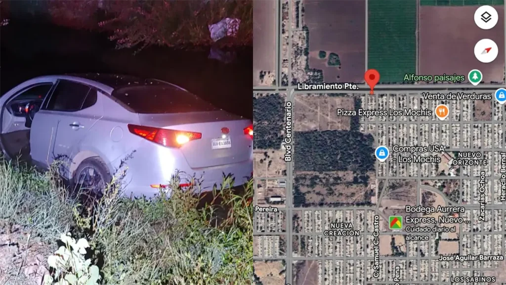 Canalazo en Los Mochis; joven, al parecer ebrio, cae a canal, huye y abandona el vehículo
