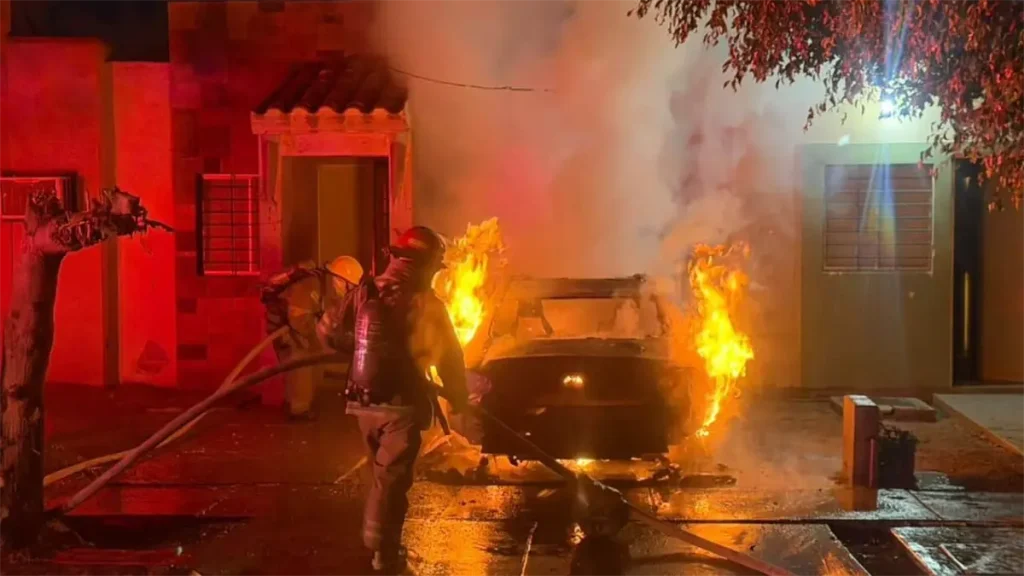 Se incendia vehículo eléctrico en Los Mochis; queda completamente calcinado
