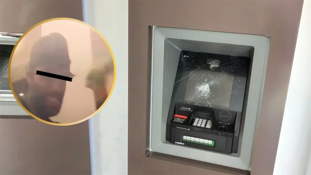 De acuerdo a imágenes proporcionadas por la sucursal bancaria, un hombre ingresó en días anteriores para dañar los dispositivos electrónicos, con un artículo de mano, provocando la falla en los mismos.