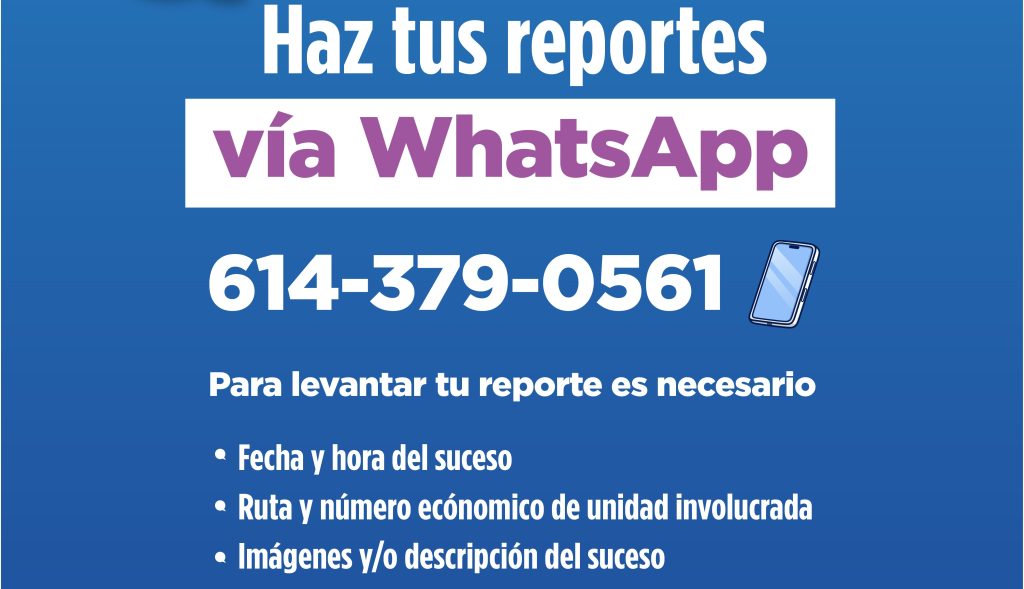 La Secretaría General de Gobierno, a través de la Subsecretaría de Transporte, invita a la ciudadanía a realizar sus reportes relacionados con el servicio de transporte público a través de mensaje de WhatsApp. Las y los usuarios podrán enviar sus mensajes al número 614-379-0561, en los cuales deben incluir la ruta y número económico de […]