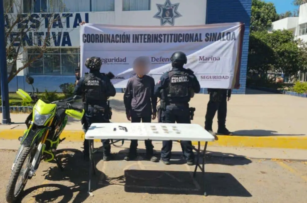 Detienen a menor de edad con un arma corta, presunta droga y una motocicleta robada en El Ranchito, Culiacán