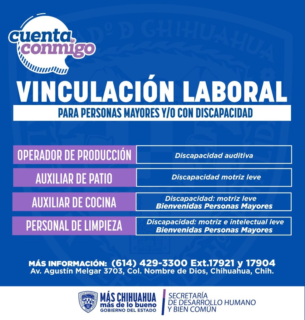 La Secretaría de Desarrollo Humano y Bien Común (SDHyBC), en colaboración con la iniciativa privada anunció la apertura de nuevas vacantes dirigidas a personas con discapacidad y adultas mayores en la ciudad de Chihuahua. El titular de la dependencia, Rafael Loera, informó que hay disponibles espacios como operadores de producción en el sector maquilador, dirigidos […]