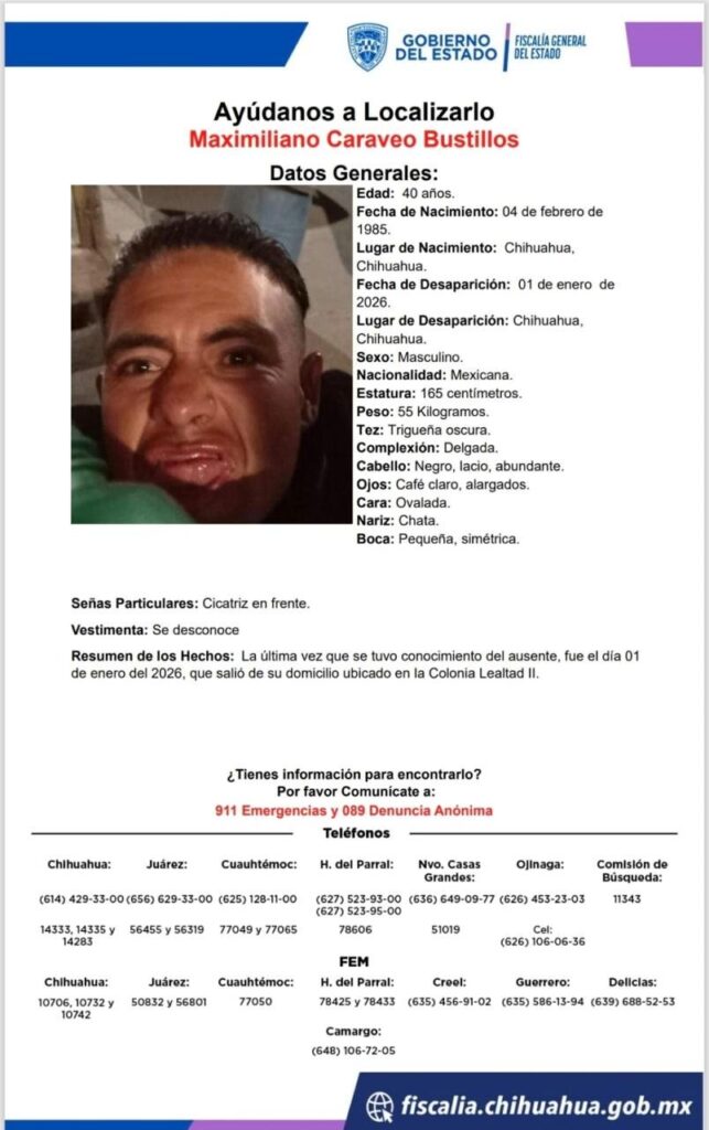 Autoridades y familiares solicitan la colaboración de la ciudadanía para dar con el paradero de Maximiliano Caraveo Bustillos, de 40 años, quien fue reportado como desaparecido en la ciudad de Chihuahua. De acuerdo con la información oficial, Maximiliano fue visto por última vez el 1 de enero de 2026, cuando salió de su domicilio ubicado […]