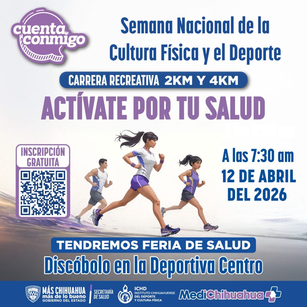 En el marco de la Semana Nacional de la Cultura Física y el Deporte, la Secretaría de Salud, a través de MediChihuahua, invita a la población a participar en la carrera recreativa de 2K y 4K “Actívate por tu salud”, diseñada para fomentar estilos de vida saludables y la convivencia familiar. Se llevará a cabo […]