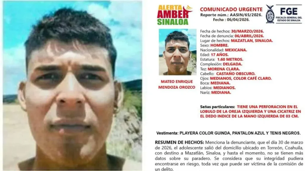 Mateo Enrique Mendoza Orosco salió desde Torreón con rumbo a Mazatlán y desde el pasado 30 de marzo sus familiares perdieron comunicación con él, por lo cual hoy lo buscan. Denuncia El joven, de 17 años, había partido desde el estado de Coahuila. Sin embargo, tras haber salido de su domicilio, ya no se volvió […]