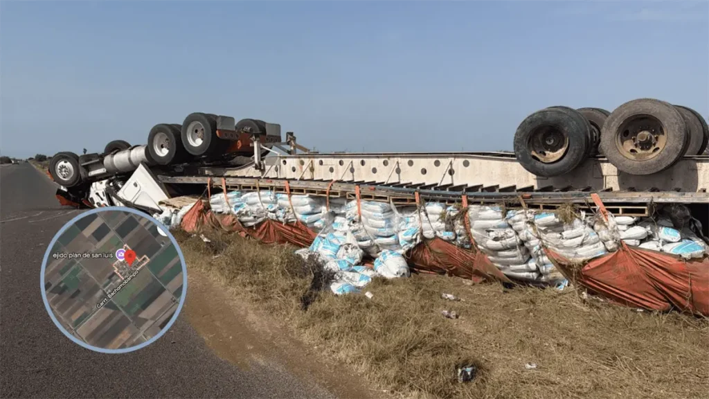 Vuelca tráiler cargado con alimento para camarón en Ahome; cabina queda aplastada y chofer se salva de milagro