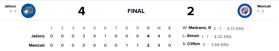 Luego de tres innings en los que los abridores mostraron solidez en la loma de los disparos, Jalisco pudo descifrar los envíos del derecho Mark Simon y fabricó rally de tres carreras en la cuarta alta; con sencillo por el central, Tirso Ornelas produjo a su hermano Julián, mientras que con línea de Connor Hollis también al CF, Mateo Gil y Tirso cruzaron los registradora.