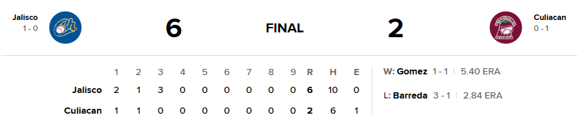 La victoria se la apuntó César Gómez (1-1), que relevó 1.1 entradas, sin permitir daños. Ronald Medrano fue el que tuvo la apertura por Jalisco, trabajando 4.0 innings, recibiendo 2 carreras. También lanzaron Miguel Aguilar, Jesús Cruz, Gerardo Reyes y Trevor Clifton.