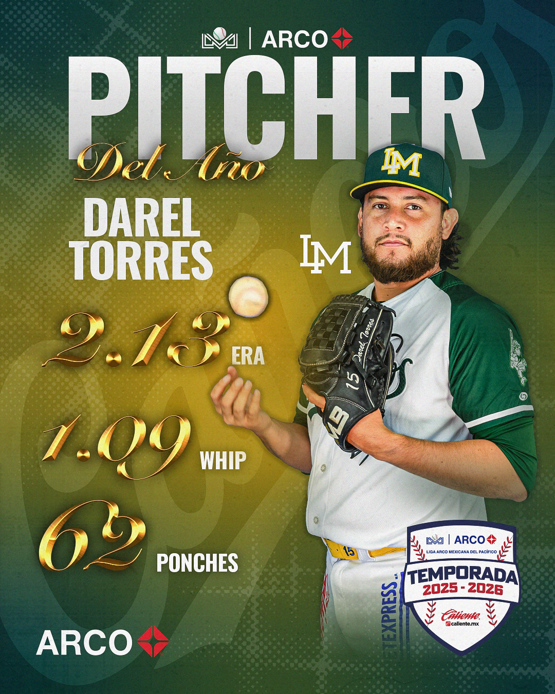 Guadalajara, Jalisco (Comunicación Liga ARCO). – Con una campaña dominante y liderando los departamentos de Efectividad (2.13), ponches (62), WHIP (1.09) y siendo sublíder de triunfos con 6, el derecho de los Cañeros de Los Mochis, Darel Torres, se lleva el Trofeo “Vicente ‘Huevo’ Romo” entregado al Pitcher del Año.
