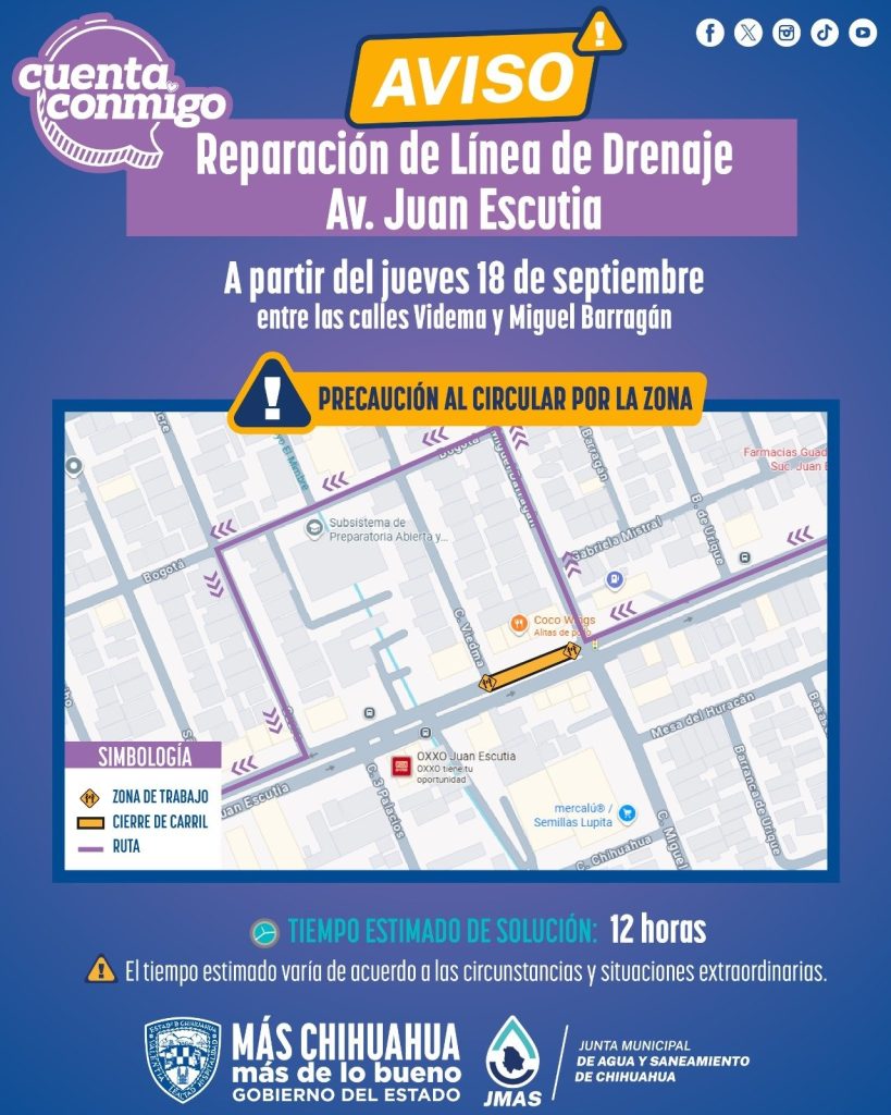 Publicidad La Junta Municipal de Agua y Saneamiento (JMAS) de Chihuahua informó que este jueves 18 de septiembre llevará a cabo los trabajos de reparación de un tramo de tubería de drenaje en la avenida Juan Escutia, entre las calles Viedma y Miguel Barragán. Las maniobras iniciarán a las 8 de la mañana y tendrán […]