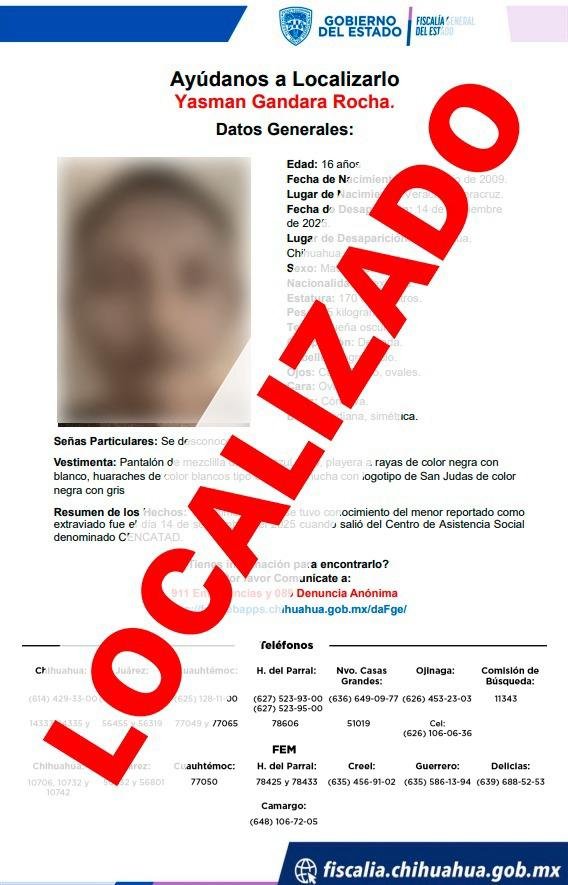 Publicidad La Unidad de Investigación de Personas Ausentes y/o No Localizadas de la Fiscalía de Distrito Zona Centro (FDZC), concluyó la carpeta de investigación iniciada por la ausencia del adolescente de iniciales A.Y.G.R., de 16 años, una vez que fue localizado sano y salvo. El pasado domingo 14 de septiembre el adolescente se salió sin […]