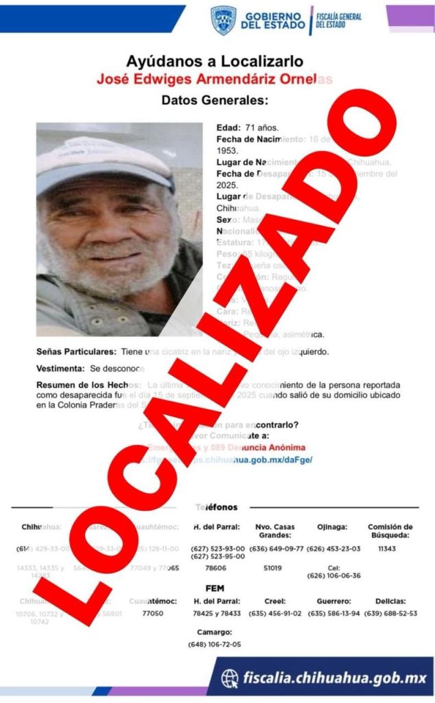 La Unidad Especializada en Investigación de Personas Desaparecidas y/o Ausentes, localizó sano y salvo a José Edwiges A. O., de 61 años de edad, quien contaba con reporte de desaparición interpuesto ayer viernes, en la ciudad de Chihuahua.