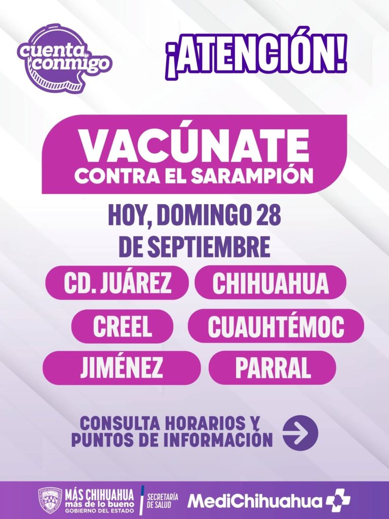 Publicidad H. Cd. de Chihuahua.- Este domingo 28 de septiembre se llevará a cabo una jornada especial de vacunación contra el sarampión en los municipios de Ciudad Juárez, Chihuahua capital, Creel, Cuauhtémoc, Jiménez y Parral. Autoridades de salud invitan a la población a acudir a su punto más cercano y revisar los horarios disponibles en […]