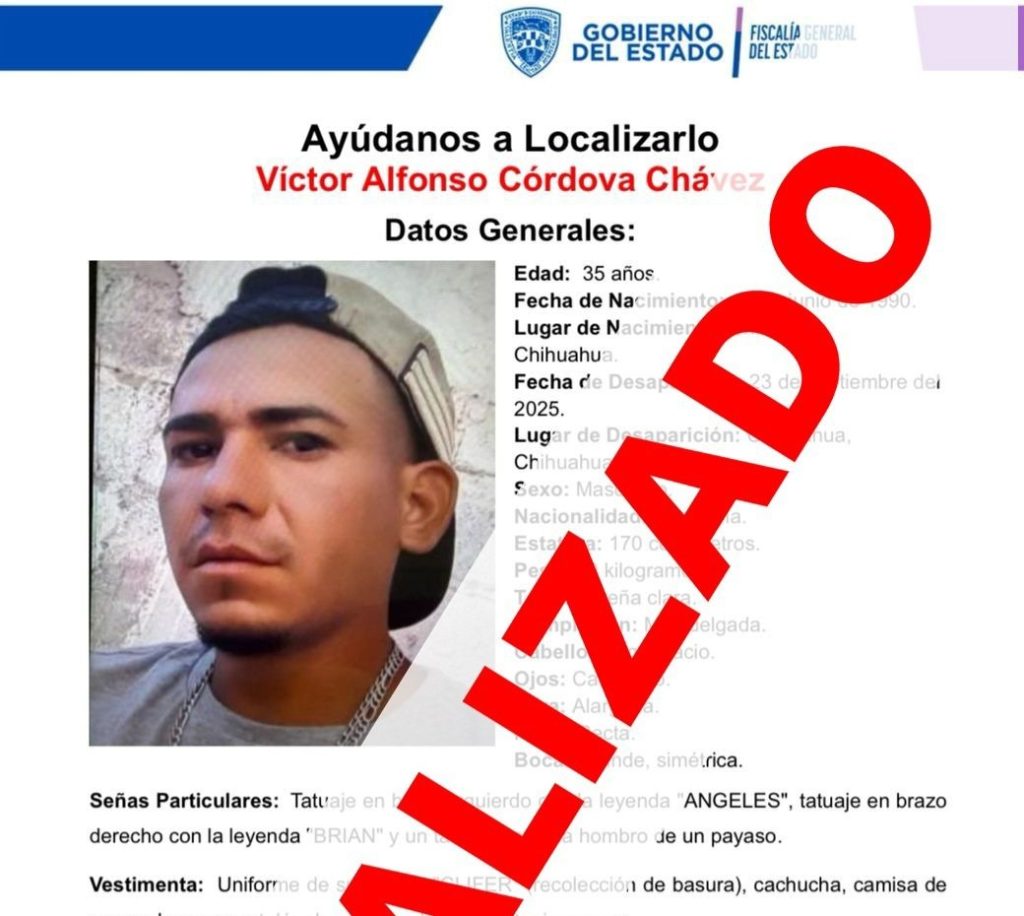 Publicidad La Unidad de Investigación de Personas Ausentes y/o No Localizadas de la Fiscalía de Distrito Zona Centro (FDZC), localizó sano y salvo a Víctor Alfonso C. Ch., de 34 años de edad, quien contaba con reporte de ausencia interpuesto el 25 de septiembre de 2025, en la ciudad de Chihuahua. Sus familiares no sabían […]