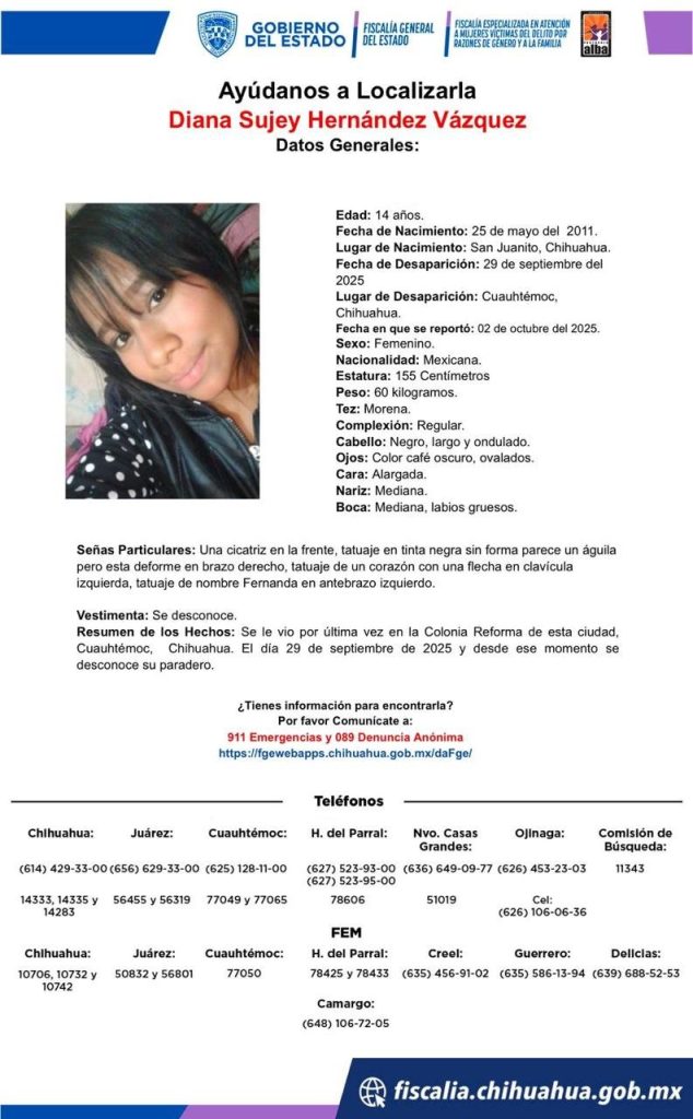 Publicidad La Fiscalía General del Estado de Chihuahua activó los protocolos de búsqueda para localizar a Diana Sujey Hernández Vázquez, una adolescente de 14 años que desapareció en el municipio de Cuauhtémoc. De acuerdo con los reportes oficiales, la joven fue vista por última vez el 29 de septiembre de 2025 en la colonia Reforma […]