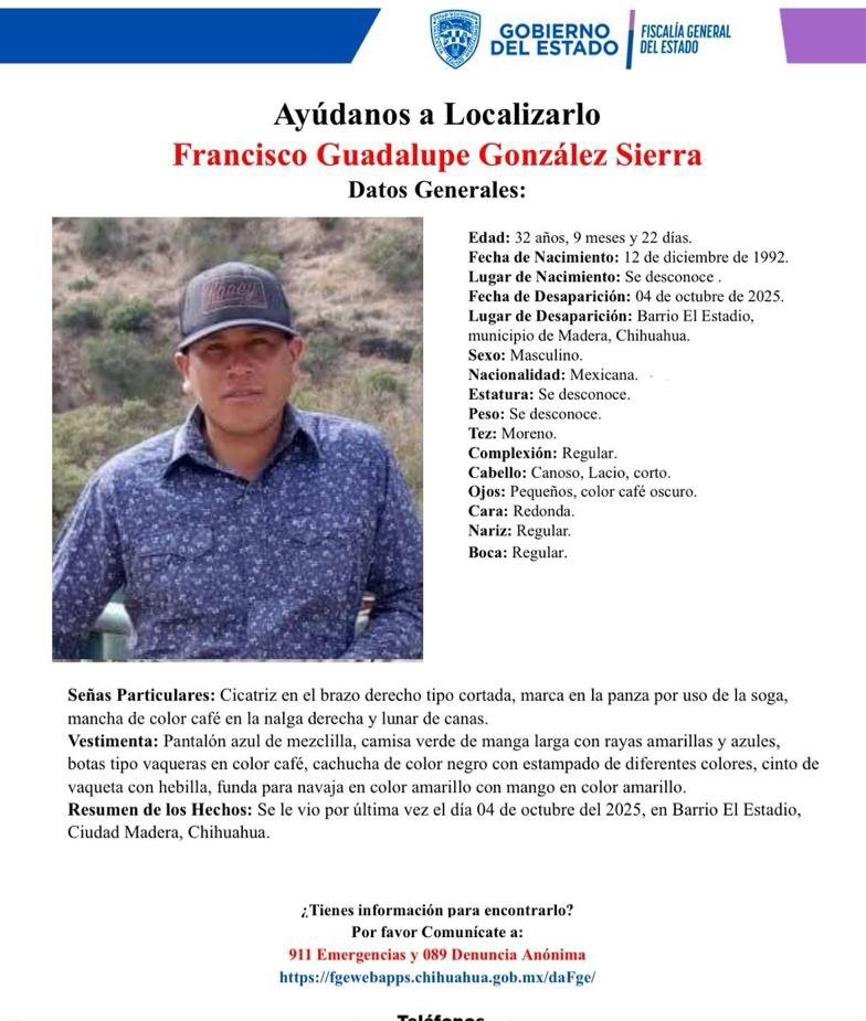 Publicidad Francisco Guadalupe González Sierra, de 32 años, fue reportado como desaparecido desde el pasado 4 de octubre de 2025 en el Barrio El Estadio, en el municipio de Madera, Chihuahua. A la fecha, las autoridades y su familia desconocen su paradero, por lo que se ha iniciado la búsqueda correspondiente para localizarlo. De acuerdo […]