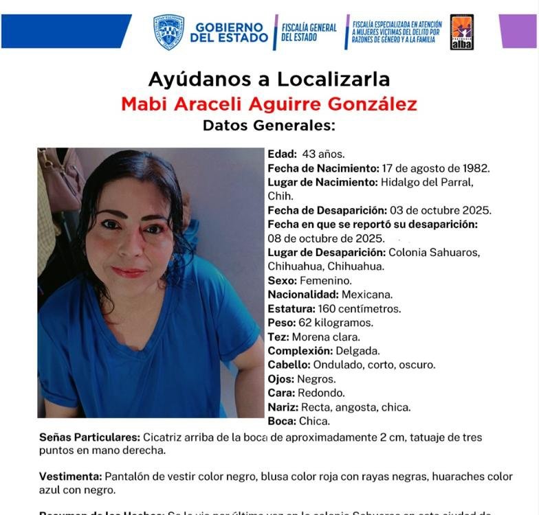 Publicidad Mabi Araceli Aguirre González, de 43 años, desapareció el pasado 3 de octubre de 2025 en la colonia Sahuaros, en la ciudad de Chihuahua. Natural de Hidalgo del Parral, Chihuahua, Mabi fue vista por última vez en su localidad y hasta la fecha se desconoce su paradero. Su desaparición fue reportada oficialmente cinco días […]