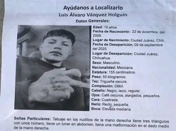 Publicidad Las autoridades y familiares solicitan el apoyo de la ciudadanía para localizar a Luis Álvaro Vázquez Holguín, un adolescente de 15 años de edad que fue visto por última vez el pasado 9 de septiembre de 2025, en la colonia Palmas del Sol, en Ciudad Juárez, Chihuahua. Desde entonces, se desconoce su paradero. Luis […]