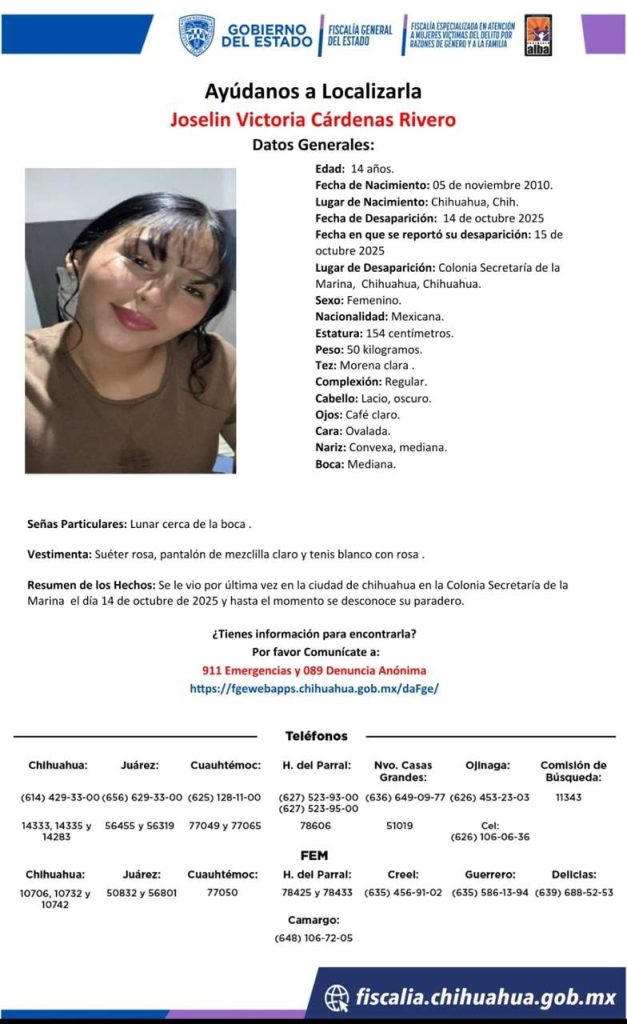 Publicidad Chihuahua, Chih.- Las autoridades activaron una alerta de búsqueda para localizar a Joselin Victoria Cárdenas Rivero, una adolescente de 14 años de edad que fue vista por última vez el 14 de octubre de 2025 en la colonia Secretaría de la Marina, en la ciudad de Chihuahua. Desde entonces, se desconoce su paradero. De […]