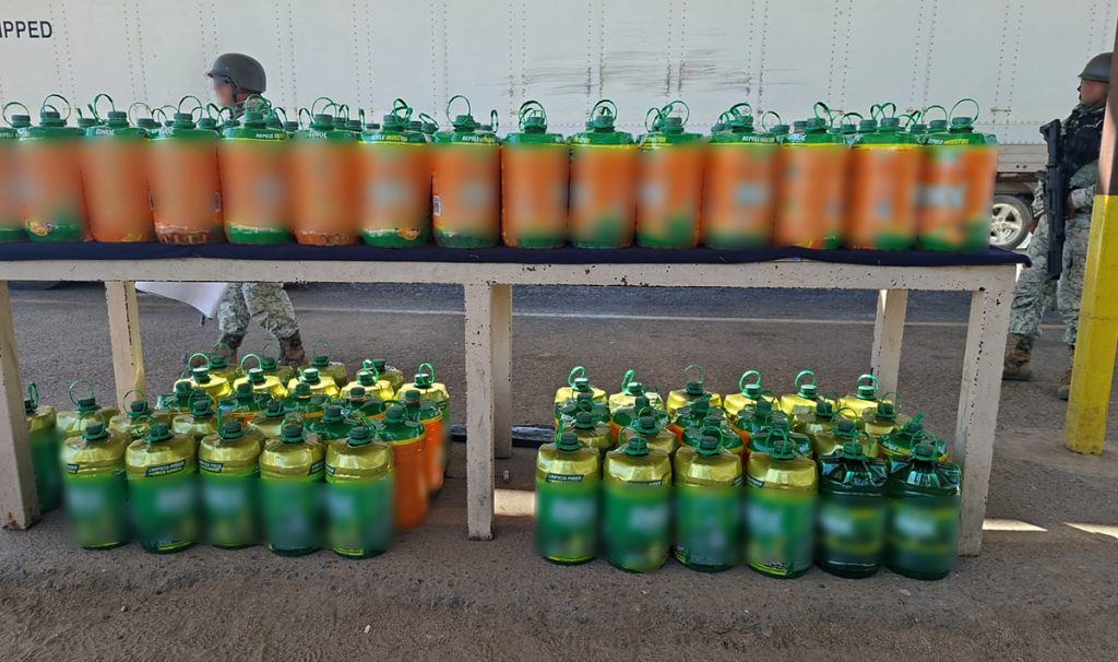 Decomisan mil 67 litros de metanfetamina oculta en bidones de limpiador en Sonora