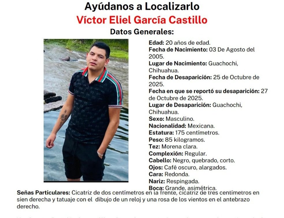 Autoridades y familiares solicitan la colaboración de la ciudadanía para localizar a Víctor Eliel García Castillo, un joven de 20 años originario de Guachochi, Chihuahua, quien fue visto por última vez el pasado 25 de octubre de 2025, y desde entonces se desconoce su paradero. La denuncia formal de su desaparición fue presentada este 27 […]
