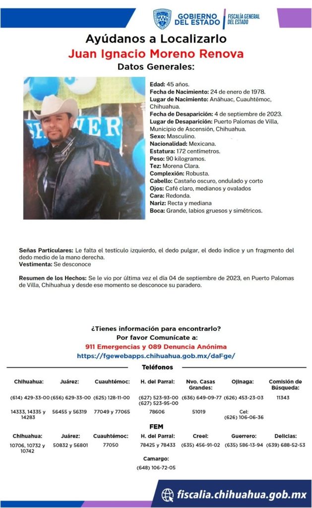Publicidad A más de un año de su desaparición, familiares y amigos de Juan Ignacio Moreno Renova continúan solicitando el apoyo de la ciudadanía y de las autoridades para localizarlo. Moreno Renova fue visto por última vez el 4 de septiembre de 2023, en Puerto Palomas de Villa, municipio de Ascensión, Chihuahua, y desde entonces […]