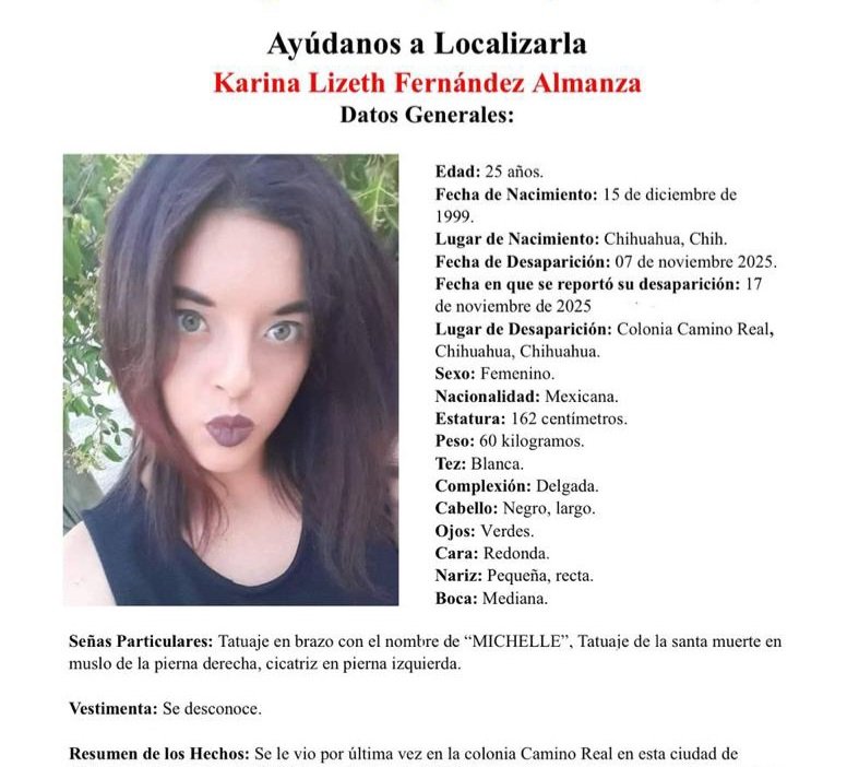 Publicidad Piden apoyo para localizar a Karina Lizeth Fernández Almanza, de 25 años, quien fue vista por última vez el 7 de noviembre de 2025 en la colonia Camino Real, en la ciudad de Chihuahua, y cuyo reporte oficial de desaparición se realizó el 17 de noviembre del mismo año. Karina Lizeth nació el 15 […]