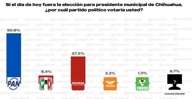 Publicidad H. Cd. de Chihuahua.- Según la más reciente encuesta realizada por RUBRUM, el Partido Acción Nacional (PAN) se mantiene como la fuerza política favorita para las próximas elecciones de presidente municipal en Chihuahua, con un 50.8% de intención de voto. En segundo lugar, se encuentra Morena con 27.5%, seguido por el PRI con 8.4%, […]