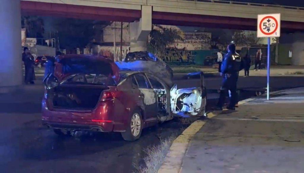 Publicidad Un vehículo de la marca Kia terminó reducido en gran parte por las llamas la tarde de este viernes, luego de que su conductor detectara un fuerte olor a quemado mientras circulaba de sur a norte por el Eje Vial Juan Gabriel, a la altura del distribuidor Sanders, en Ciudad Juárez. De acuerdo con […]