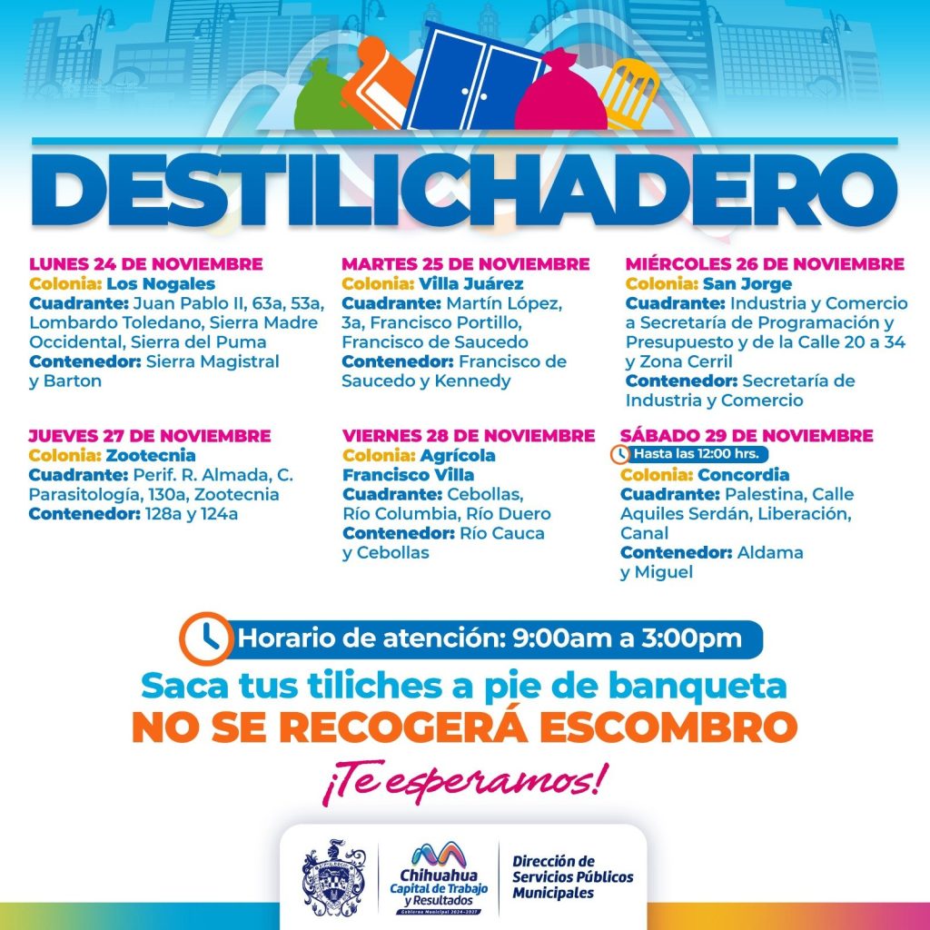 Publicidad H. Cd. de Chihuahua.- El Gobierno Municipal anunció el calendario del programa Destilichadero para seis colonias, con el fin de evitar acumulaciones de basura que generen plagas, malos olores o riesgos sanitarios. El operativo se llevará a cabo del 24 al 29 de noviembre. El servicio incluye contenedores fijos y recorridos en cuadrantes donde […]