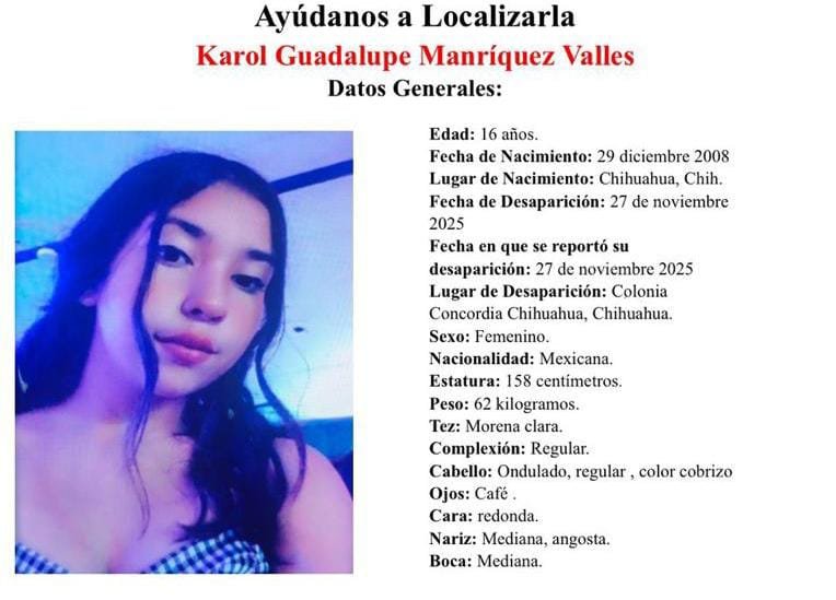 Publicidad H. Cd de Chihuahua.- La Fiscalía General del Estado emitió una ficha de búsqueda para localizar a Karol Guadalupe Manríquez Valles, de 16 años, desaparecida desde el 27 de noviembre de 2025 en la colonia Concordia, en la ciudad de Chihuahua. De acuerdo con la información oficial, la joven mide 1.58 metros, pesa 62 […]