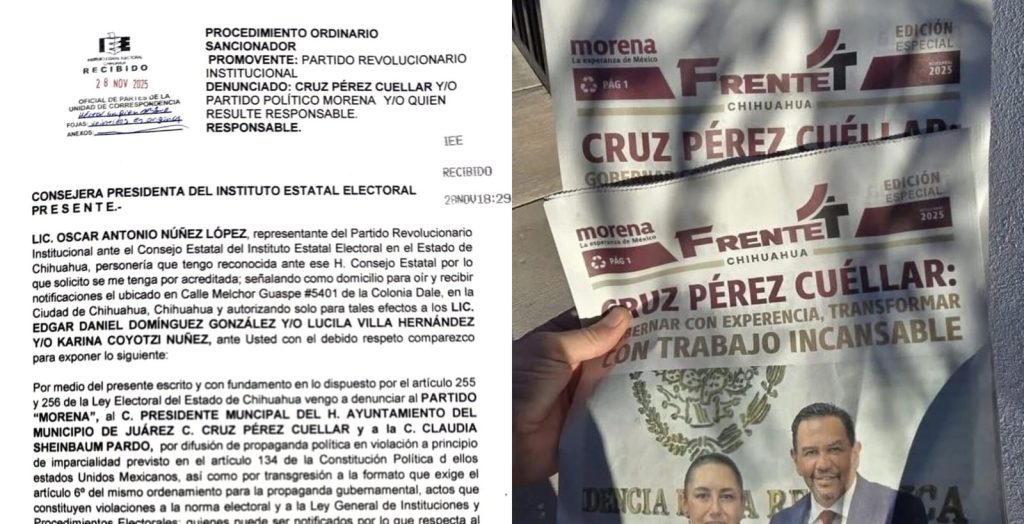 Publicidad H. Cd de Chihuahua.- El PRI Chihuahua presentó una denuncia ante el Instituto Estatal Electoral (IEE) contra Cruz Pérez Cuéllar y el partido Morena, por presuntamente distribuir propaganda gubernamental ilegal en distintos puntos de la capital. La queja incluye un tabloide donde aparecen el nombre e imagen de Pérez Cuéllar junto a la presidenta […]