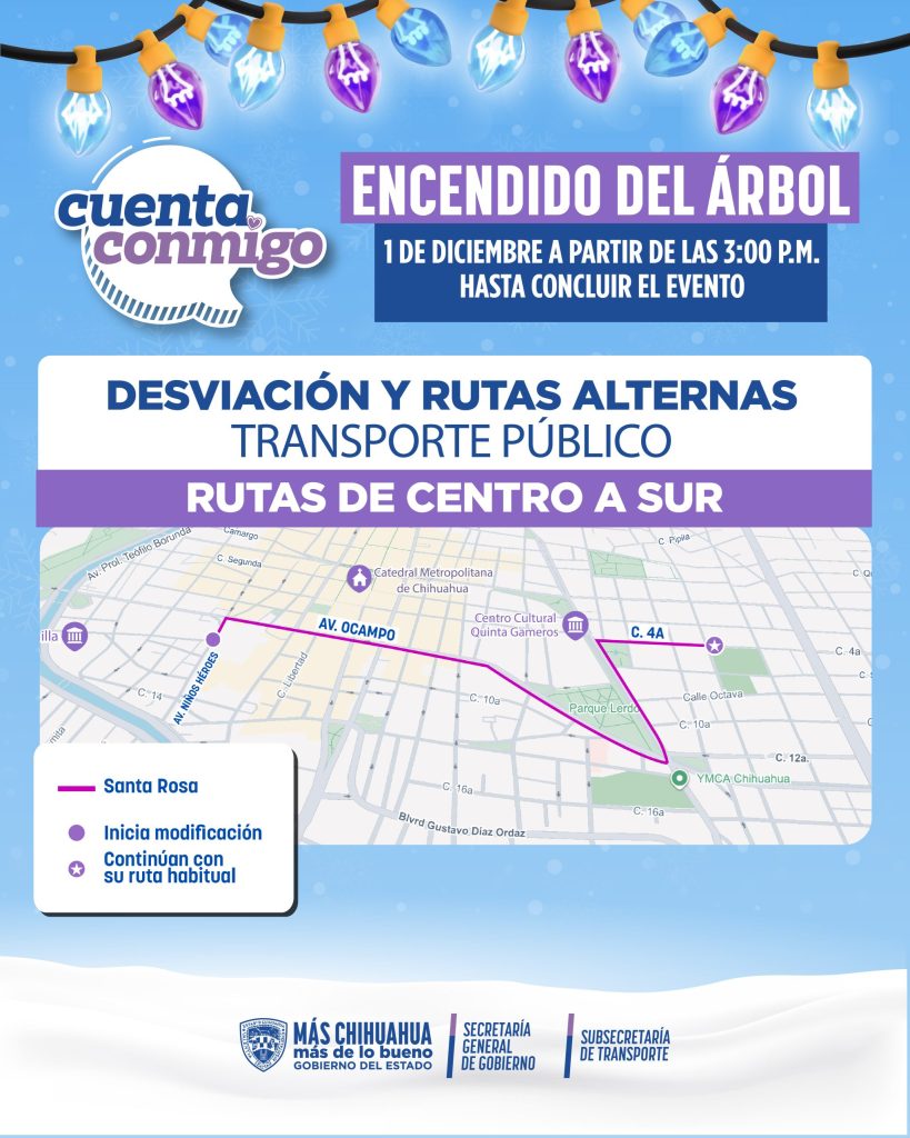 Publicidad H. Cd de Chihuahua.- La Subsecretaría de Transporte del Gobierno del Estado anunció cambios temporales en varias rutas de transporte público de la ciudad con motivo del Encendido del Árbol Navideño 2025, que se realizará este lunes 1 de diciembre. Entre los cambios destacan desviaciones de avenidas como Colón, Juárez, Paseo Bolívar, Teófilo Borunda, […]